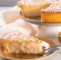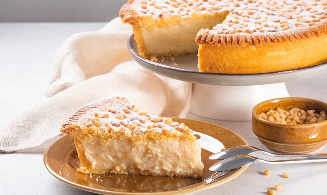 Kremo vzamemo iz hladilnika in jo razporedimo po testu. Razvaljamo še manjši kos testa in z njim pokrijemo torto. Robove dobro stisnemo z vilicami, površino pa večkrat prebodemo. S prsti lahko oblikujemo valovit rob. Torto premažemo s stepenim beljakom in posujemo s pinjolami, ki smo jih prej 10 minut namakali v hladni vodi, da se ne bi zažgale.