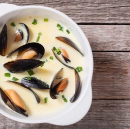5 Zalijemo z tekočino, v kateri smo kuhali školjke, prilijemo še smetano za kuhanje in sladko smetano, preverimo slanost. Če se nam zdi preslano, dodamo še malo mleka. V juho damo še školjke, pustimo minuto, da se segrejejo in takoj postrežemo. Potresemo še z nasekljano zeleno.
