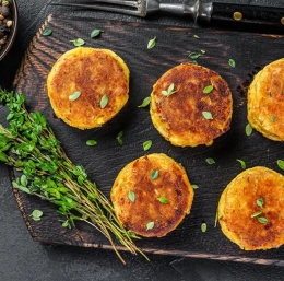 Z navlaženimi rokami zajemamo maso in oblikujemo najprej v kroglo in potem sploščimo, kot polpet. Povaljamo v moki in na preostalem olju ocvremo do zlato-rumene barve.