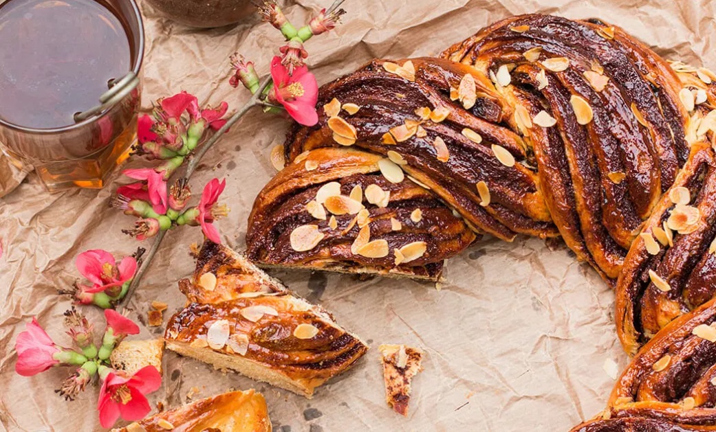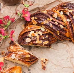 Spletemo v kito in zavijemo v hlebček. Po vrhu premažemo z jajcem ter potresemo z mandljevimi lističi. 15 minut pečemo na 180 stopinj in še 25 minut na 150 stopinjah.