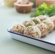 Vsako kroglico povaljajte v moki, razžvrkljanih jajcih in mletih ovsenih kosmičih oziroma drobtinah.