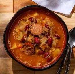 Pred serviranjem jo pogrejemo, meso in klobase narežemo in postrežemo s kruhom. Pa dober tek.