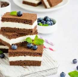 Narežemo na poljubno velike kose ter okrasimo s svežimi borovnicami ali kakšnim drugim sadjem in postrežemo.