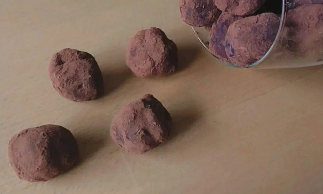 Z dvema žličkama iz mase oblikujemo manjše kroglice. Povaljamo jih v kakavu, zložimo na krožnik in damo v hladilnik, da se učvrstijo.