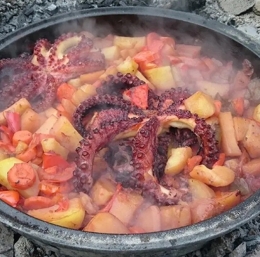 Hobotnici odmrznemo, črepnjo postavimo na žerjavico, vanjo vlijemo deciliter olja in, ko se segreje, na njem popečemo hobotnico z vseh strani. Pečemo nekaj minut, da spremeni barvo in spusti vodo.