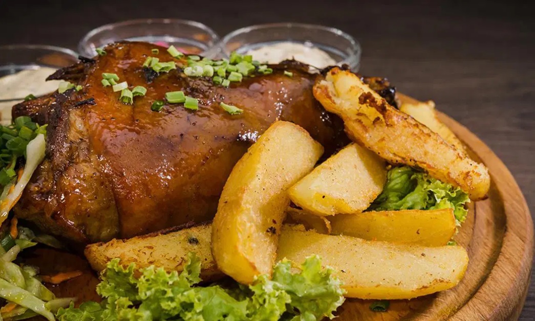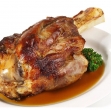 Kračo postavimo iz pečice na desko, pustimo počivati vsaj deset minut in jo narežemo. Postrežemo skupaj z zelenjavo in krompirjem, ki sta se pekla poleg krače, in polijemo s sokom od pečenja.