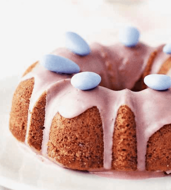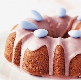 Testo z žlico predenemo v pripravljeni model in ga po vrhu poravnamo. Pečemo približno 35 minut, da kolač naraste in postane čvrst na dotik. Pustimo, da se nekoliko ohladi v modlu, nato pa ga pazljivo vzamemo ven, potem ko smo ga od oboda ločili s paletnim nožem. Ohladimo ga na kuhinjski mrežici.