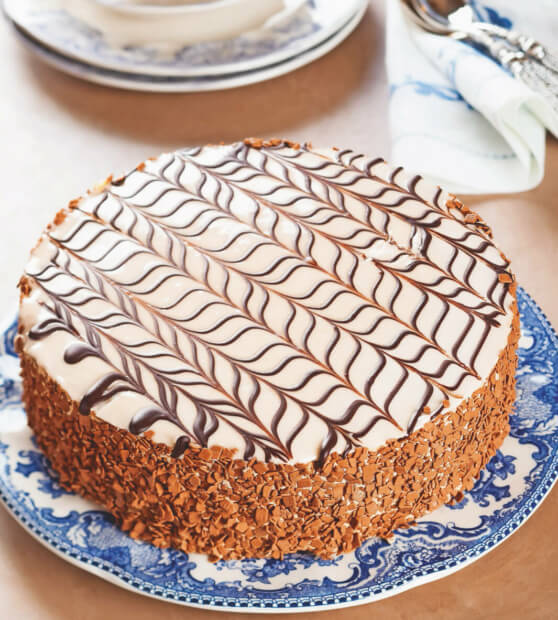 Torto po obodu obložimo z mandljevimi lističi ali čokoladnimi ostružki. Postavimo jo v hladilnik, da se krema učvrsti. Torto razrežemo na kose z ostrim nožem in postrežemo.