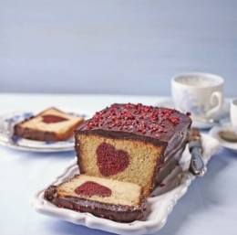 Ponovimo postopek iz prve točke in pripravimo drugo biskvitno testo brez kakava in barvila. Tri četrtine mase na- lijemo v pripravljen model. Spodnje vogalčke src potisnemo v testo, tako da so srca tesno drugo ob drugem. Po njih z žlico naložimo preostalo testo tako, da prekriva srca. Pečemo 1 uro oziroma tako dolgo, da je zobotrebec, ki ga zapičimo v biskvit, čist, ko ga izvlečemo. Pustimo, da se testo 10 minut ohlaja v modlu, nato ga prestavimo na kuhinjsko mrežico, da se do konca ohladi.