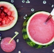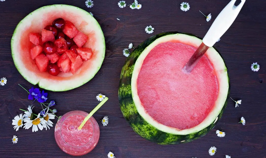 Lubenico po širini prerežemo na pol in jo z žlico izdolbemo. Tudi na spodnji strani odrežemo tanek kos, da se lubenica ne kotali.