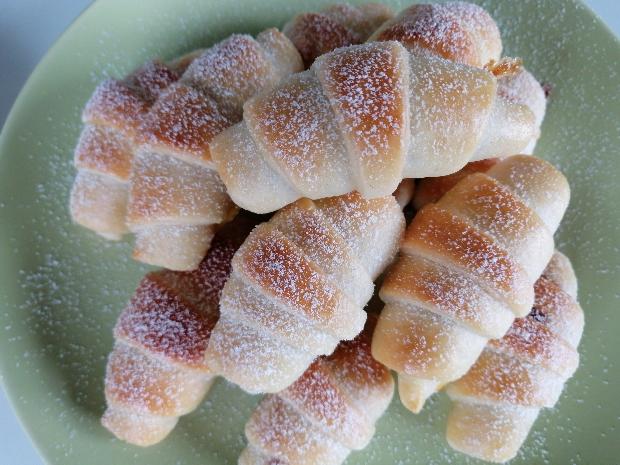 Vsak kupček testa nežno, brez gnetenja, oblikujemo v kroglo in začnemo z valjanjem. Vsak posamezen kupček testa razvaljamo na približno pol centimetra debelo, ter ga razrežem na trikotničke. Vsakemu trikotniku naredim še zarezo na zunanji stranici.