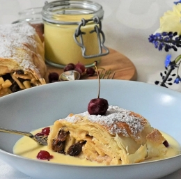 Jabolčni zavitek z vanilijevo kremo je idealen za hladnejše dni, saj greje s prijetnimi aromami cimeta in vanilije. S svojo hrustljavo teksturo in kremnim prelivom pa bo zadovoljil še tako zahtevne sladokusce.