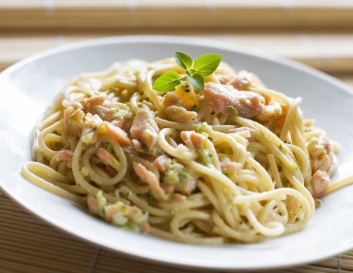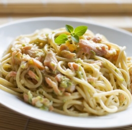 Dodamo sol, limonin sok in poper. Koper in zeleni del koromača nasekljamo, potresemo v omako in jo ponudimo s špageti.