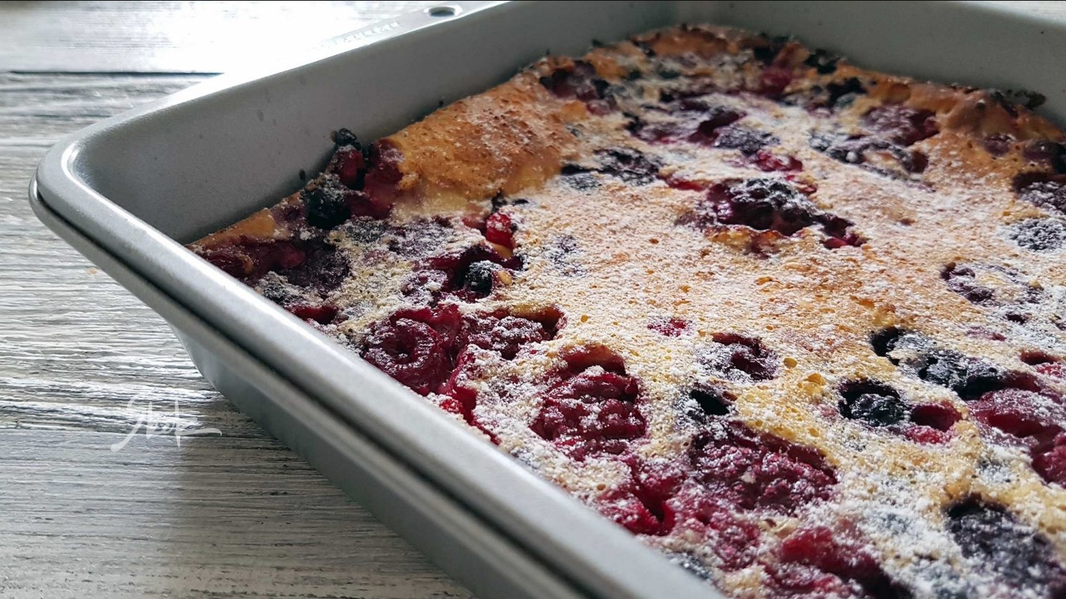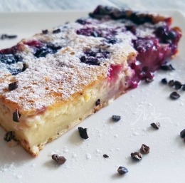 Zgrabi porcijo jagodičevja, sladkor, mleko, maslo, moko, jajca in vanilijo ter speci kolač, ki ima svoje korenine v francoskem kolaču clafoutis. Slednjemu se lahko približaš še bolj tako, da uporabiš temne češnje.
