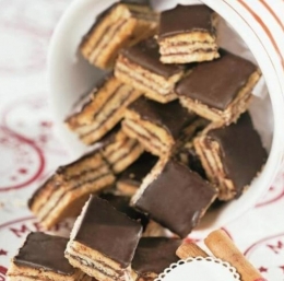 Čokoladno glazuro pripravimo tako, da čokolado za kuhanje in kokosovo maslo raztopimo v vodni kopeli in gladko zmešamo. Ko se kolač ohladi, ga prevlečemo s čokoladno glazuro. Še preden se glazura popolnoma strdi, kolač narežemo na primerno velike kocke.