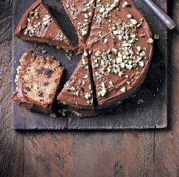 Kolač odstranimo iz pekača, ga premažemo z oblivom, posipamo s preostalimi oreški in postrežemo.