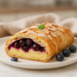 Za pripravo ne potrebujete veliko: že pripravljeno vlečeno testo (ali eno plast listnatega testa v zvitku), borovnice (sveže ali zamrznjene) in vanilijev puding, ki ga lahko pripravite sami iz vrečke, a z malce prilagojeno gostoto. Rezultat? Hrustl skorja, mehka notranjost in bogat, sveže-sladek nadev.