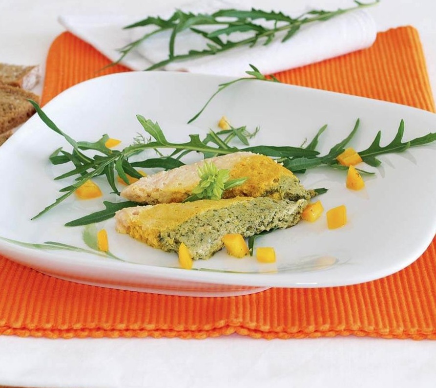 160 g lososovega fileja brez kože 1 beljak ½ lončka kisle smetane 2 žlici zdrobljenega ledu sol poper 330 g fileja poljubne bele ribe brez kože 1 žlička kurkume nekaj vejic peteršilja