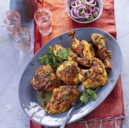 Vse začimbe stresemo v suho ponev in jih popražimo ter nato s tolkačem v možnarju zdrobimo v prah. Limonov sok, strt česen, nariban ingver, kokosovo mleko in nasekljan čili, kateremu smo odstranili semena, v multipraktiku zmešamo s ščepom soli in drugimi začimbami, da dobimo pasto. Marinado vtremo v piščanca in ga pustimo stati v hladilniku vsaj 2 uri, lahko tudi čez noč.