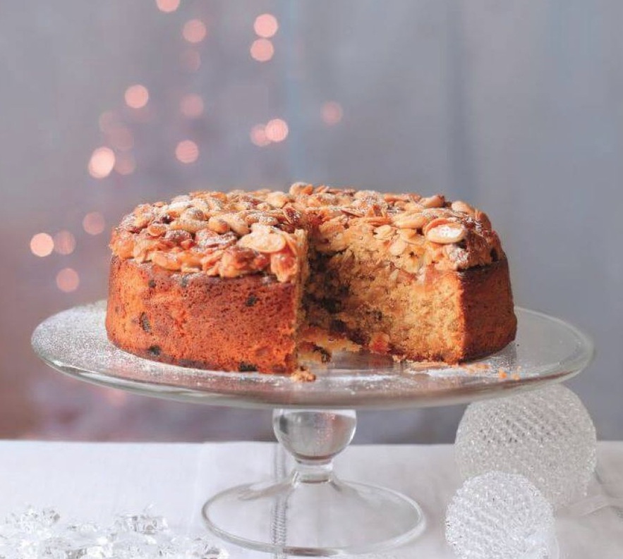 Po želji lahko kolač okrasimo še z mandljevo oblogo. V tem primeru kolač vzamemo iz pečice 10 minut prej, temperaturo pečice pa zvišamo na 200 °C. V kozici počasi segrejemo zlati sirup in maslo. Ko sta stopljena in tekoča, vmešamo pražene mandljeve lističe, cele mandlje in moko. Z dvema žličkama zajemamo maso in jo razporedimo po vsej površini kolača. Kolač nato vrnemo v pečico in ga pečemo še 12 do 15 minut, da se obloga lepo zlato zapeče, nato ga ohladimo in vzamemo iz modla ter obod ovijemo z okrasnim papirjem. Lahno ga poprašimo s sladkorjem v prahu. Kolač lahko okrašen ali zavit v papir za peko in folijo hranimo en mesec.