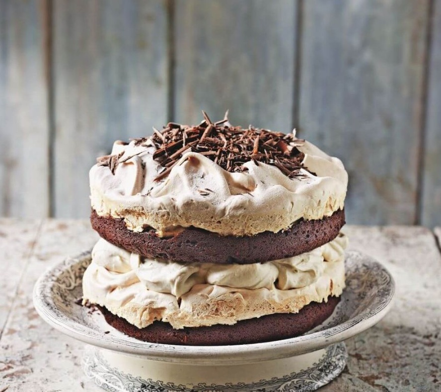 Metlice električnega mešalnika in skledo hitro očistimo in v njej beljake stepemo v čvrst sneg. Z žlico postopoma dodajamo sladkor in neprestano stepamo, da dobimo gosto in čvrsto meringo. Meringo z žlico razdelimo po masi v obeh modlih, nato jo z zadnjo stranjo žlice razmažemo po celotni površini. Zapolnimo vrzeli ob robovih in oblikujemo lepe vrtinčaste jamice in vršičke. Modla damo v pečico in pečemo 1 uro in 15 minut, da je zobotrebec, ki ga zapičimo v testo, še vlažen, ko ga vzamemo iz sredine torte, in se ga držijo drobtinice. Popolnoma ohladimo.
