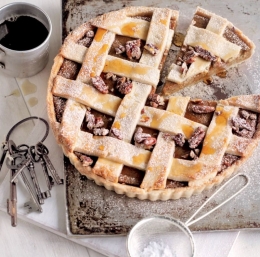 Pečemo še 15 do 20 minut ali toliko časa, da se testena mreža zlato rjavo zapeče, nadev pa naraste in je v sredini še malce mehak. Pustimo, da se popolnoma ohladi, nato obrežemo robove in pito poprašimo s sladkorjem v prahu. Pokapamo z javorovim sirupom in postrežemo s stepeno sladko smetano.