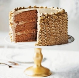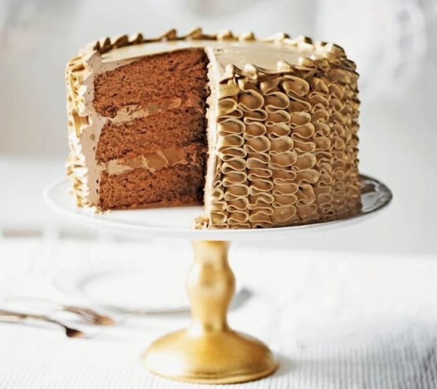 225 g zmehčanega masla 175 g sladkorja 175 g svetlega sladkorja muskovado 4 velika jajca 325 g moke 25 g koruznega škroba 1 žlica mletega cimeta 1 žlička mletega ingverja 1 žlička mešanice začimb za medenjake 1 ½ žlice pecilnega praška 3 dl polnomastnega mleka jedilna zlata barva v pršilu za okras (po želji) maslo za pekače