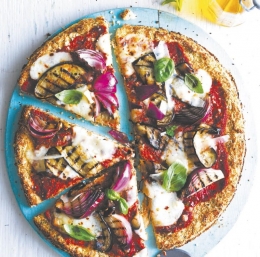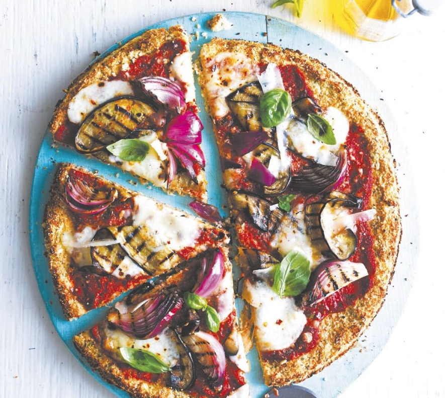 Ko je cvetačna osnova pečena, jo pustimo, da se malo ohladi. Temperaturo v pečici povišamo na 240 °C. Mocarelo odcedimo in jo osušimo s kuhinjsko brisačo. Cvetačno osnovo namažemo s paradižnikovo omako, posujemo z malo sira, nato po njej razporedimo jajčevec, čebulo in mocarelo. Posujemo s čilijem in postavimo v pečico za 10 do 12 minut. Preden postrežemo, po vrhu nastrgamo še malo sira in okrasimo s preostalimi listi bazilike.