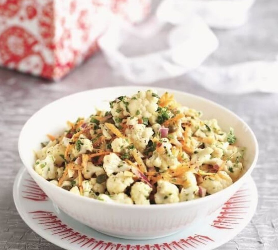 1 manjša ali ½ večje cvetače 2 naribana korenčka 1 rdeča čebula 2 žlički kaper 2 žlici sesekljanega peteršilja 1 žlica belega vinskega kisa 1 žlička dijonske gorčice 2 žlici oljčnega olja 1 žlička majoneze sol poper