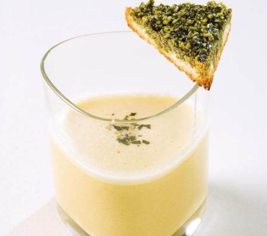 Preden kremno juho iz zelene in ovčjega sira postrežemo, jo ponovno penasto zmešamo in nalijemo v primerne steklene posodice, zraven pa ponudimo popečene kruhke.