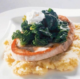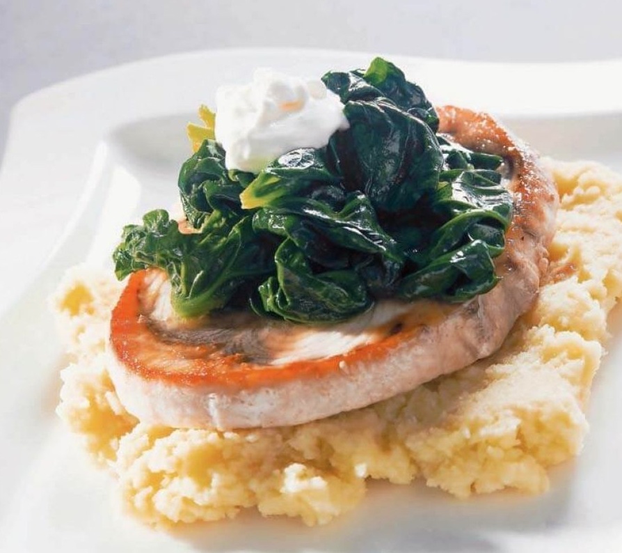 Postrežemo tako, da na krožnik postavimo nekaj krompirjevega pireja, nanj položimo popečeno mečarico, nanjo nekaj špinače in po vrhu dodamo žličko ali dve ohlajenega jogurta.