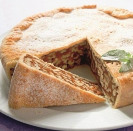 Pečico segrejemo na 200 °C. Testo na rahlo pomokani delovni površini razvaljamo 4 mm debelo. Ohlajen nadev vzamemo iz modla in model zdaj premažemo z maslom. Z dvema tretjinama testa obložimo model (eno tretjino prihranimo za pokrov). Odvečno testo obrežemo tako, da čez rob pustimo viseti 2 cm testa.