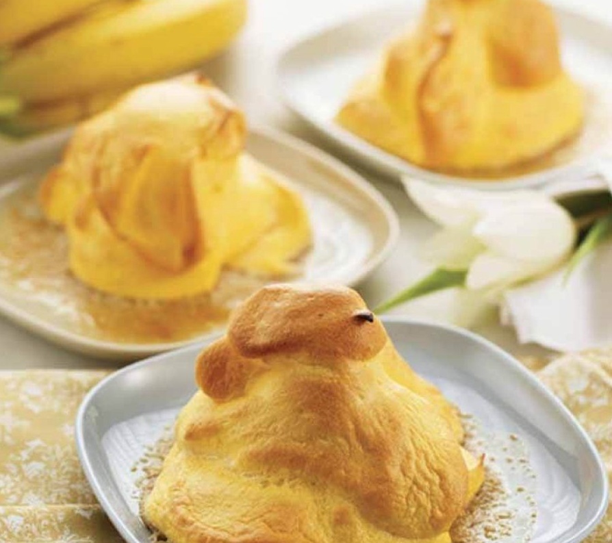 Banani olupimo in vsako razrežemo na tri dele. V šest ognjevarnih modelčkov damo po žlico medu in mleka ter košček banane. Beljake ločimo od rumenjakov, nato pa beljake s ščepcem soli in kristalnim sladkorjem rahlo stepemo. Z metlico za stepanje vmešamo v sneg limonovo lupinico, rumenjake in moko.