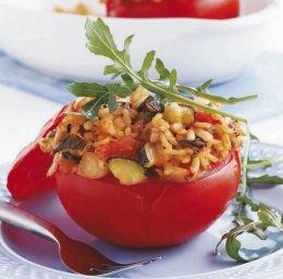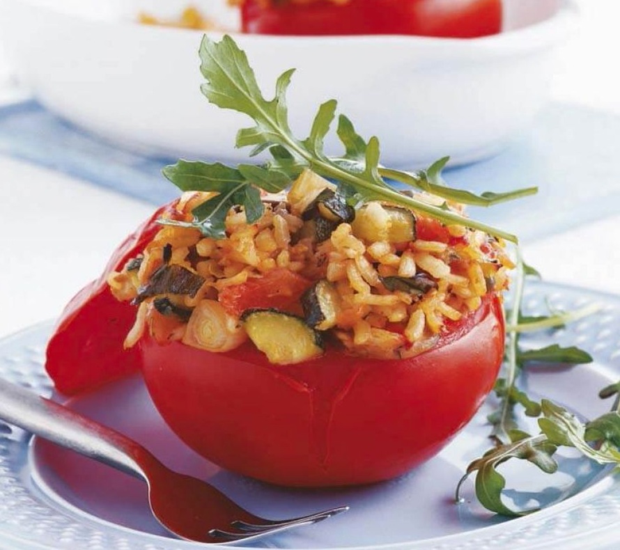 Pečico segrejemo na 170 °C. Paradižnika položimo v pekač in napolnimo z rižem, pokrijemo z odrezanimi vrhovi paradižnika in pečemo 10 do 15 minut, da se paradižnik zmehča. Počakamo 5 minut, da se jed malo ohladi, nato jo okrasimo z nekaj listi rukole.