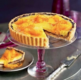 Medtem pripravimo nadev. Penasto stepemo jajca s sladkorjem, nato vtepemo še limonov in pomarančni sok, pomarančno lupino in smetano. Maso prihranimo, medtem pa nad soparo stopimo čokolado. Ko je testena podlaga za pito ohlajena, obrežemo odvečno testo, ki visi čez rob, podlago pa s čopičem premažemo s stopljeno čokolado. Če se vsa čokolada ne oprime testa, ga malo ohladimo, še enkrat premažemo s čokolado in še enkrat ohladimo.