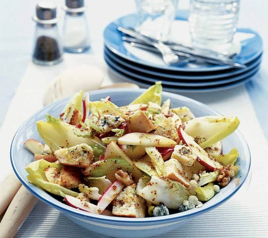 2 česnovi štručki, vsaka po 150 g 2 glavi radiča 2 stebli stebelne zelene šopek redkvic 50 g orehov 2 rdeči jabolki 170 g sira z modro plesnijo preliv 4–5 žlic medu gorčični preliv
