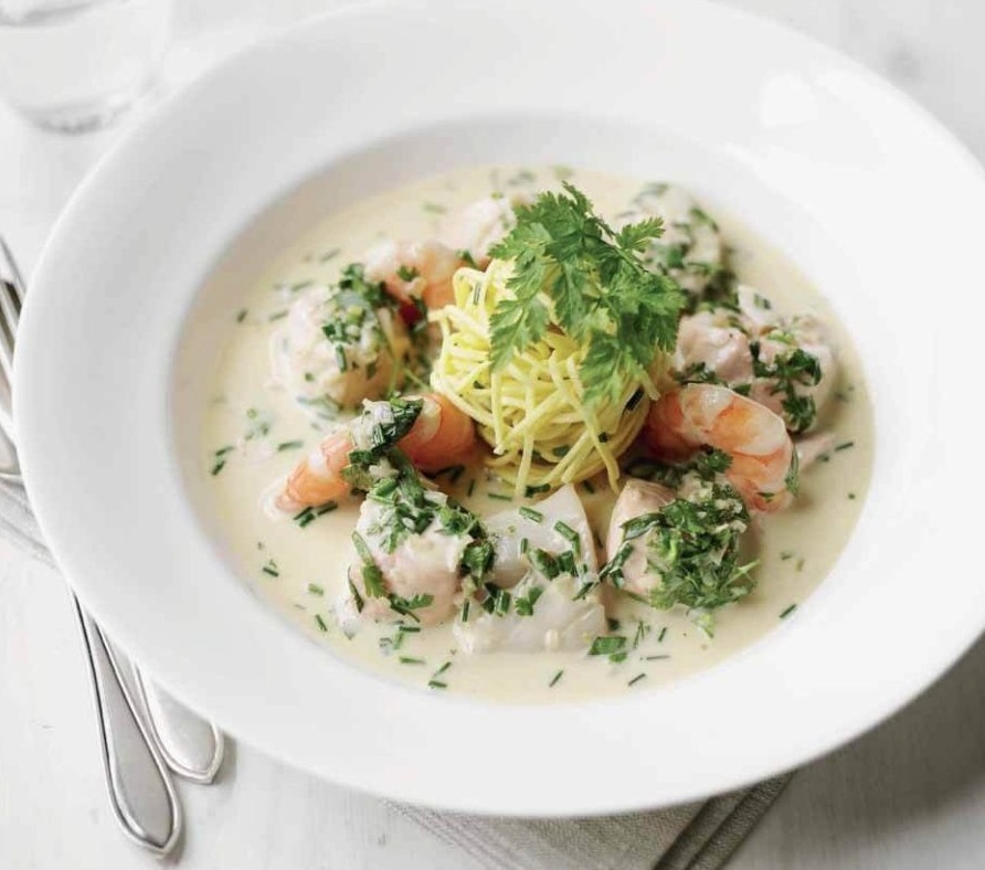 8 ostrig 300 g lososovega fileja brez kože 3 velike ali 6 manjših pokrovač 6 orjaških tigrastih kozic 0,5 l sveže ribje jušne osnove 50 g masla 1 velika šalotka 2 dl belega vina ali suhega vermuta 1,5 dl smetane za stepanje pest drobno sesekljanih svežih zelišč (med njimi naj bosta tudi peteršilj in drobnjak) 1 žlica limonovega soka 150 g špagetov nekaj kapljic oljčnega olja vejica peteršilja ali prave krebuljice za okras Preberite tudi