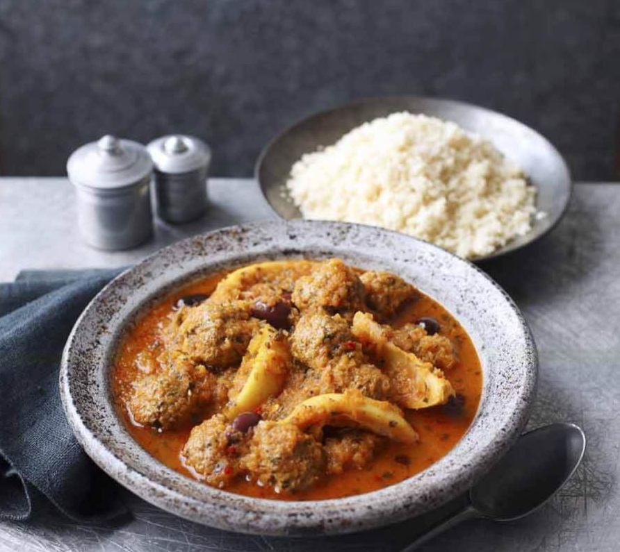 Ingver olupimo in naribamo, čiliju odstranimo semena in ga drobno sesekljamo. V veliki ponvi s pokrovom ali tagini segrejemo oljčno olje. Dodamo preostalo čebulo, ingver, čili in žafran. Pražimo 5 minut, da se čebula zmehča in začne dobivati barvo. Dodamo limonov sok, osnovo, paradižnikovo mezgo in olive. Omako zavremo in vanjo previdno vstavimo mesne kroglice. Temperaturo zmanjšamo, posodo pokrijemo in kuhamo 20 minut. Kroglice nekajkrat obrnemo.