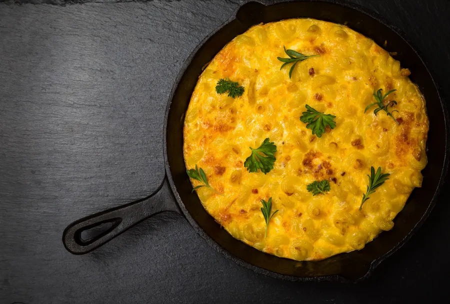 Ponev, ki je primerna za pečico, najprej segrejte na srednje močnem ognju in vanjo dodajte tri žlice olja. Zatem prilijte maso z jajci in testeninami ter počakajte, da na dnu postane hrustl. Jed v ponvi nato za pet minut položite v pečico, da dobi bolj čvrsto obliko.