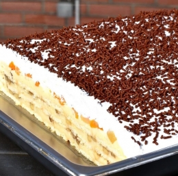 Piškote takoj namažemo s tretjino (620 g) vroče (tople) kreme in po njej razporedimo 2 na majhne koščke narezani banani. 160 g piškotov ponovno namažemo, dodamo 620 g kreme in dodamo narezane banane.