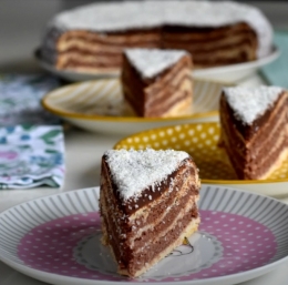 Po pol ure razvaljamo vse 4 krogle testa na mere pomaščenega in pomokanega modela z diagonalo 26′ cm. Po vrstnem redu naložite testo/kremo/testo/kremo/testo/kremo/testo.