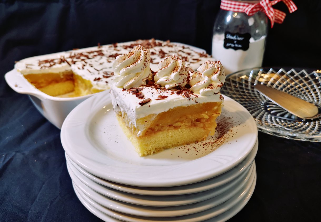 Starejša generacija se zagotovo spomni tega preprostega in osvežilnega jabolčnega peciva, ki je pogosto kraljo na mizah gospodinj, ki so kaj dale nase. Puhast biskvit, sladka jabolka, aromatična pudingova krema in slastna sladka smetana. Toliko dobrih okusov in vsi povezani v popolno celoto.