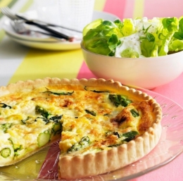 V skodelici razžvrkljamo jajce, dodamo rikoto, gorčico in kislo smetano ter primešamo pršut, šparglje in sir.