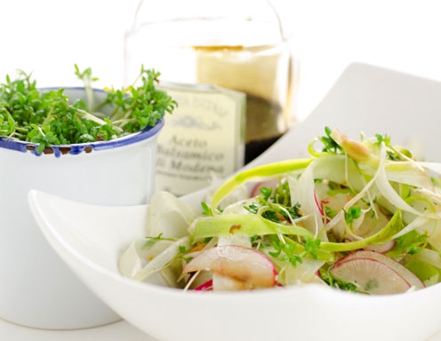 Surove beluše podolgem olupimo, tako da dobimo fine dolge trakove. Špargelj začinimo s čajno žličko soli in sladkorja in dobro zmešamo. Redkvice narežemo na kolobarje ter zmešamo z vrtno krešo in pinjolami, balzamični kis zmešamo z medom in olivnim oljem ter začinimo s soljo in poprom.