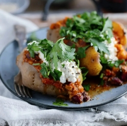 Ta jed je bogata in nasitna, zato jo lahko brez težav postrežemo kot glavno jed s skledo solate. Ena porcija (en večji polnjen krompir) ima približno: