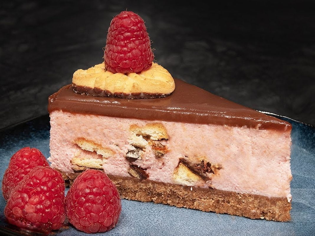 Torto “Domaćica” okrasite s piškoti in malinami.