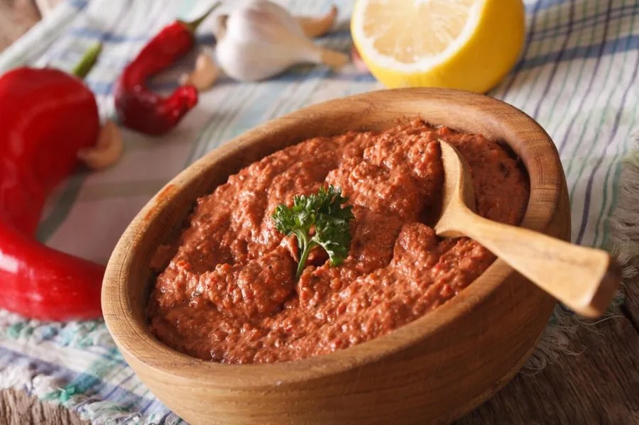 | Muhamara je okusna tradicionalna jed z Bližnjega vzhoda, narejena iz pečenih paprik, orehov in začimb.