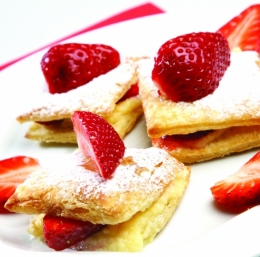 Pečene kvadratke prečno prerežemo, spodnji del napolnimo s kremo, obložimo z narezanimi jagodami in pokrijemo. Blazinice potresemo s sladkorjem in okrasimo s celimi jagodami.