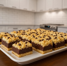 Trik, zaradi katerega je ta pita videti »slaščičarsko«, je naribano testo. Med peko ustvari nežen, drobljiv vrhnji sloj, ki se krasno ujame z mehko čokoladno kremo pod njim.