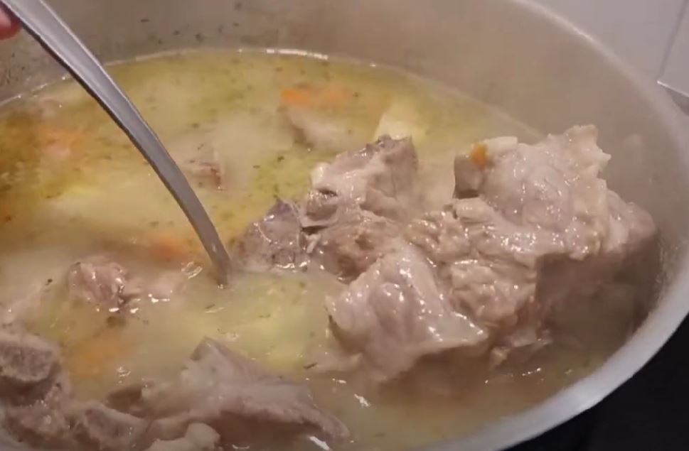 Popraženo meso in čebulo dodamo v lonec k svinjskim nogicam in zelenjavi.